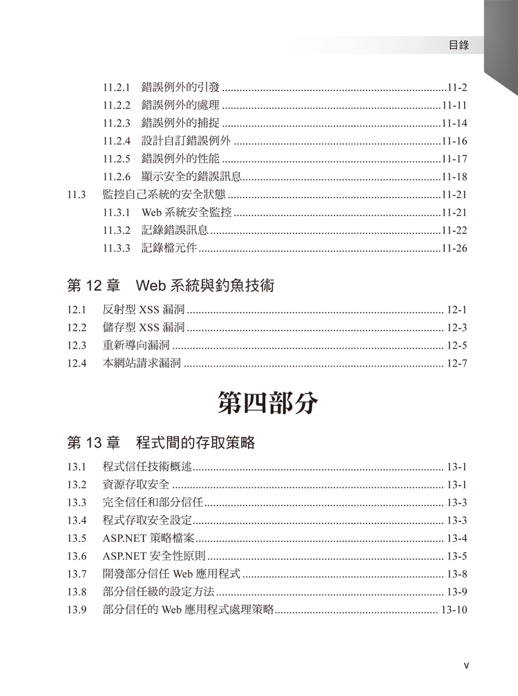 第三部分闡述如何使用與程式執行平臺有關的安全功能,包括元件安全、會話安全、代碼信任和網站釣魚技術的防治。這部分內容非常實用,透過對伺服器和Web系統相關配置檔進行設置。從而加倍地強化Web系統的安全可靠性。